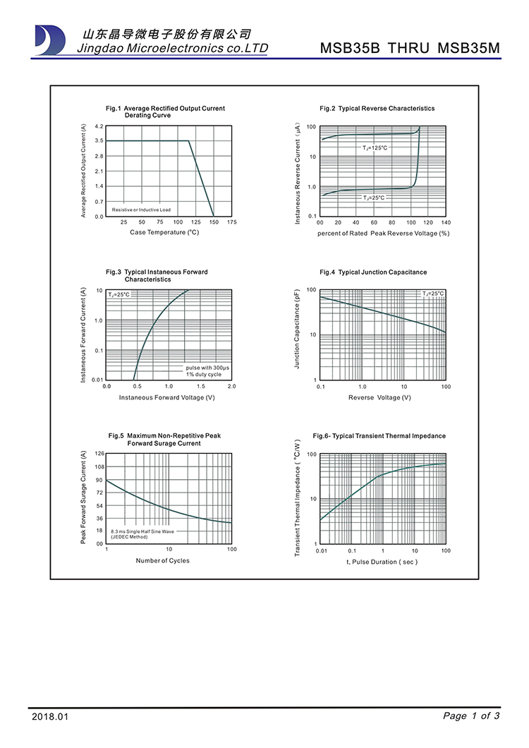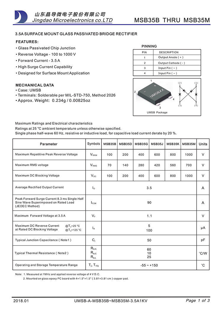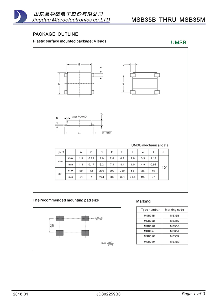 JINGDAO/晶导微 原厂原装全新正品贴片整流桥堆:MSB35M、MSB35K、MSB35J、MSB35G;最大正向平均整流电流IF:3.5A;最大正向峰值抗浪涌电流IFSM:90A;最大反向峰值电压VRRM:1200V~200V;正向管压降VF:1.05V;反向漏电流IR:5ua;工作储存芯片结温:-55℃~150℃;安装封装方式:MSB-4 : 6.9*8.8*1.5mm。