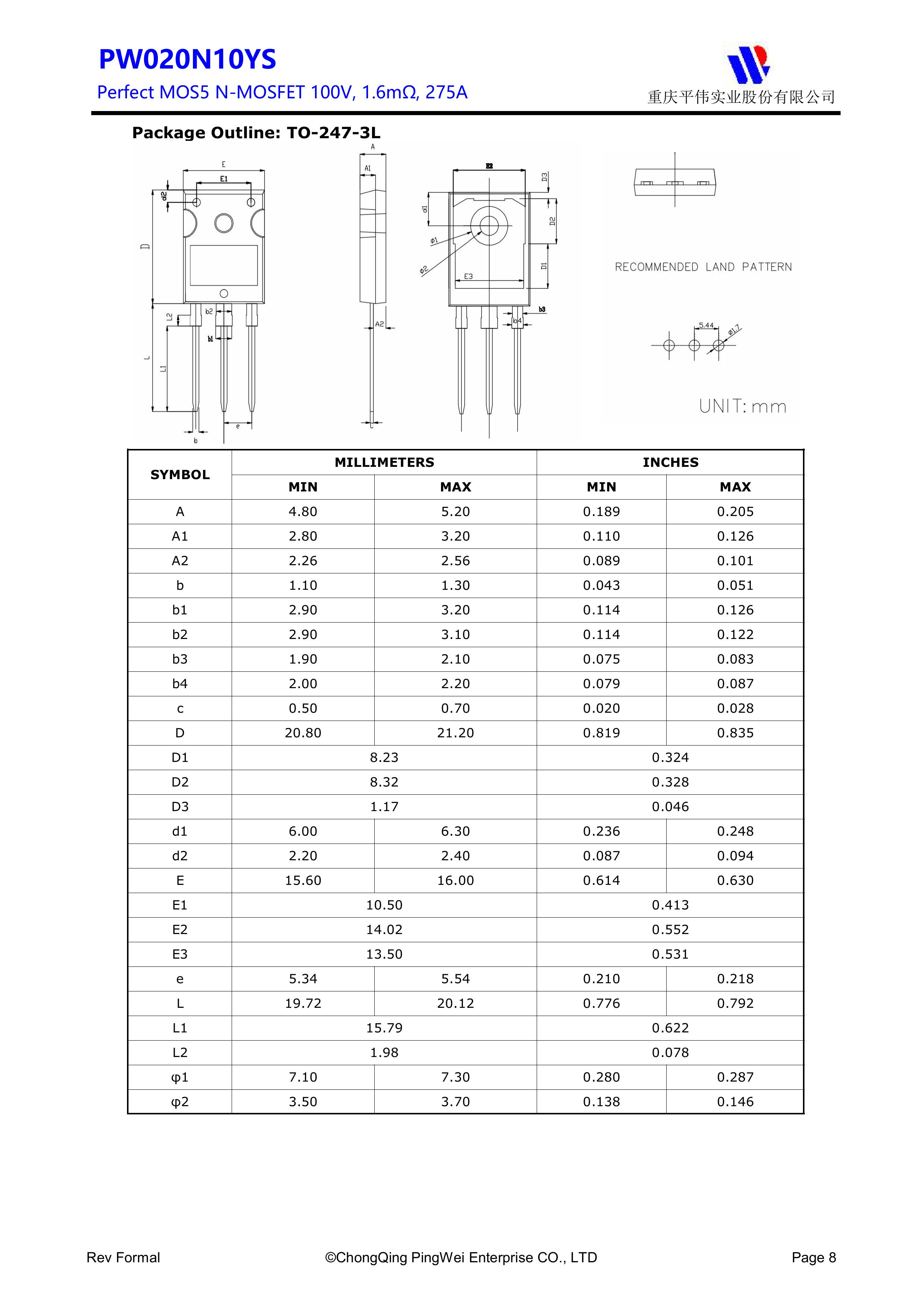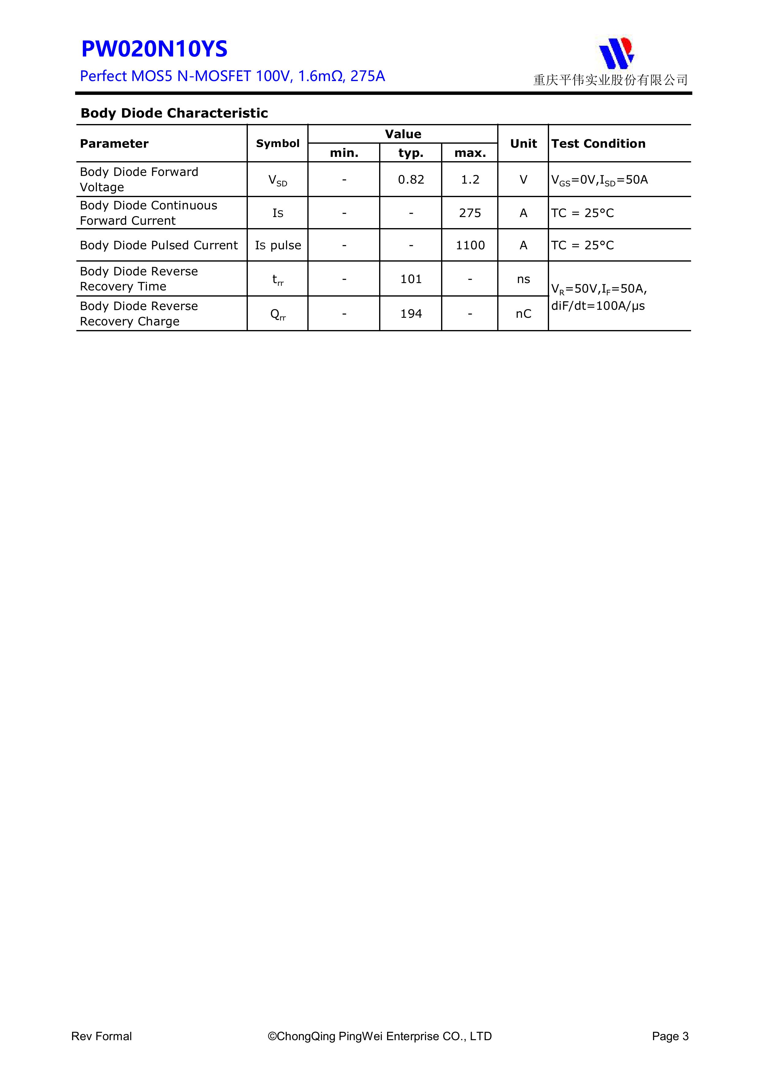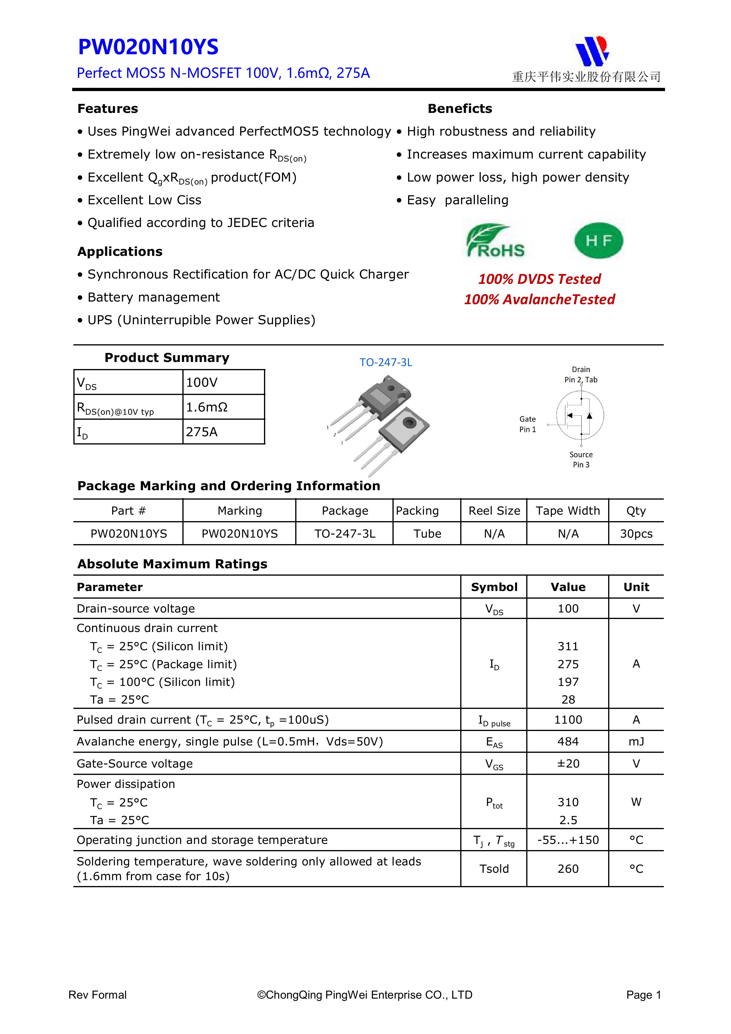 "页面标价非成交价,请联系详询报价” PY/平伟实业股份 全新原厂原装高频高压功率控制开关管场效应管,100V,311A,1.6mΩ,N-Channel,中低压MOSFET:PW020N10YS;电压Vds:100V;电流Id:311A;内阻Rds(on):1.6mΩ;封装方式:TO-247-3L;最小包装数量:600pcs/盒-管装。