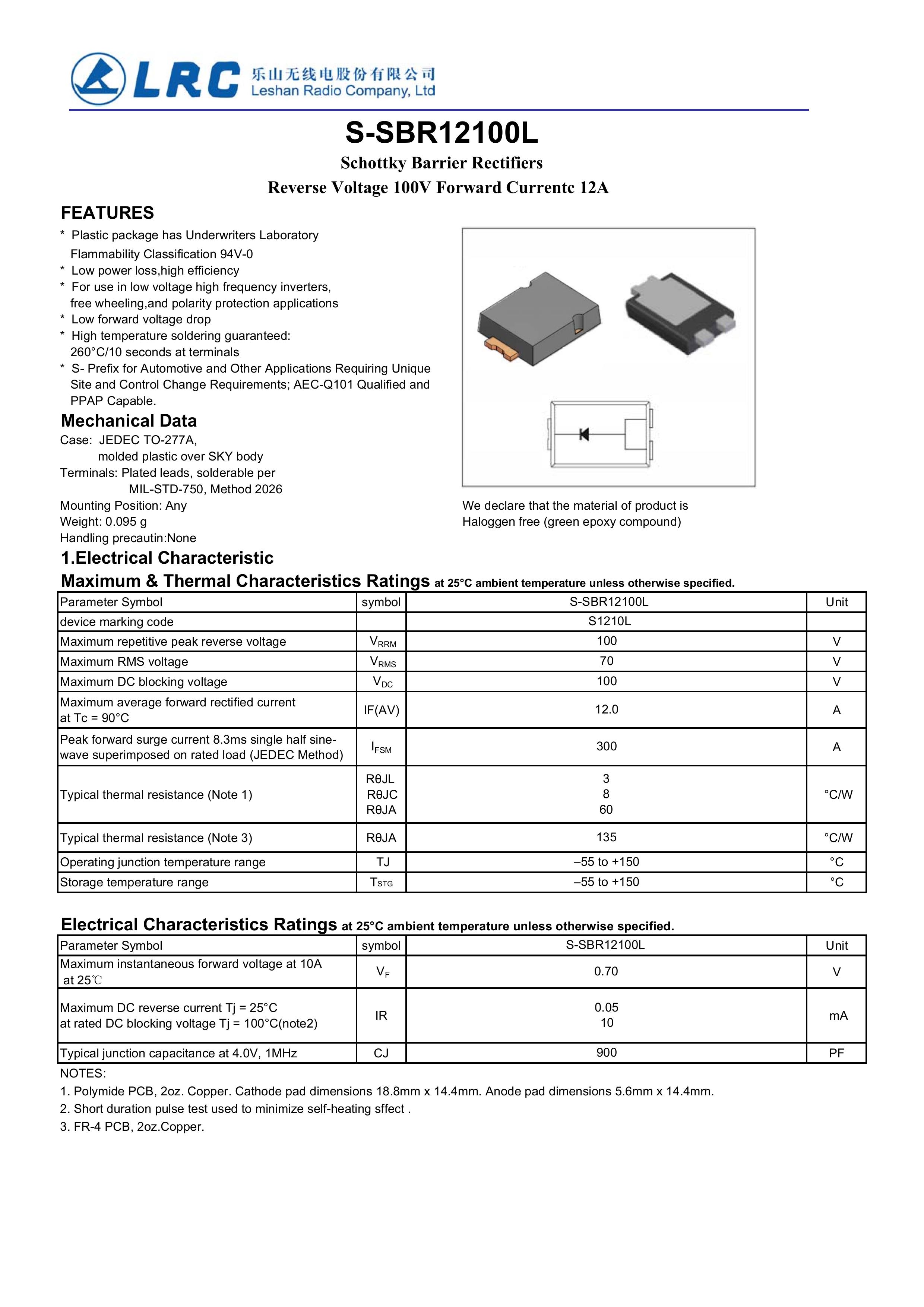 LRC/乐山无线电 S-SBR12100L/S1210L 全新原厂原装高频中低压功率整流管车规级LOW-VF低压降肖特基12A、100V,小体贴片封装车规级低压降肖特基二极管:S-SBR12100L/S1210L;反向耐电压:100V;正向平均电流:12A;正向压降VF:0.7V;反向恢复时间Trr:5ns;芯片结温:-55℃~150℃;封装方式:TO-277;最小包装数量:3000pcs/盘-编带。