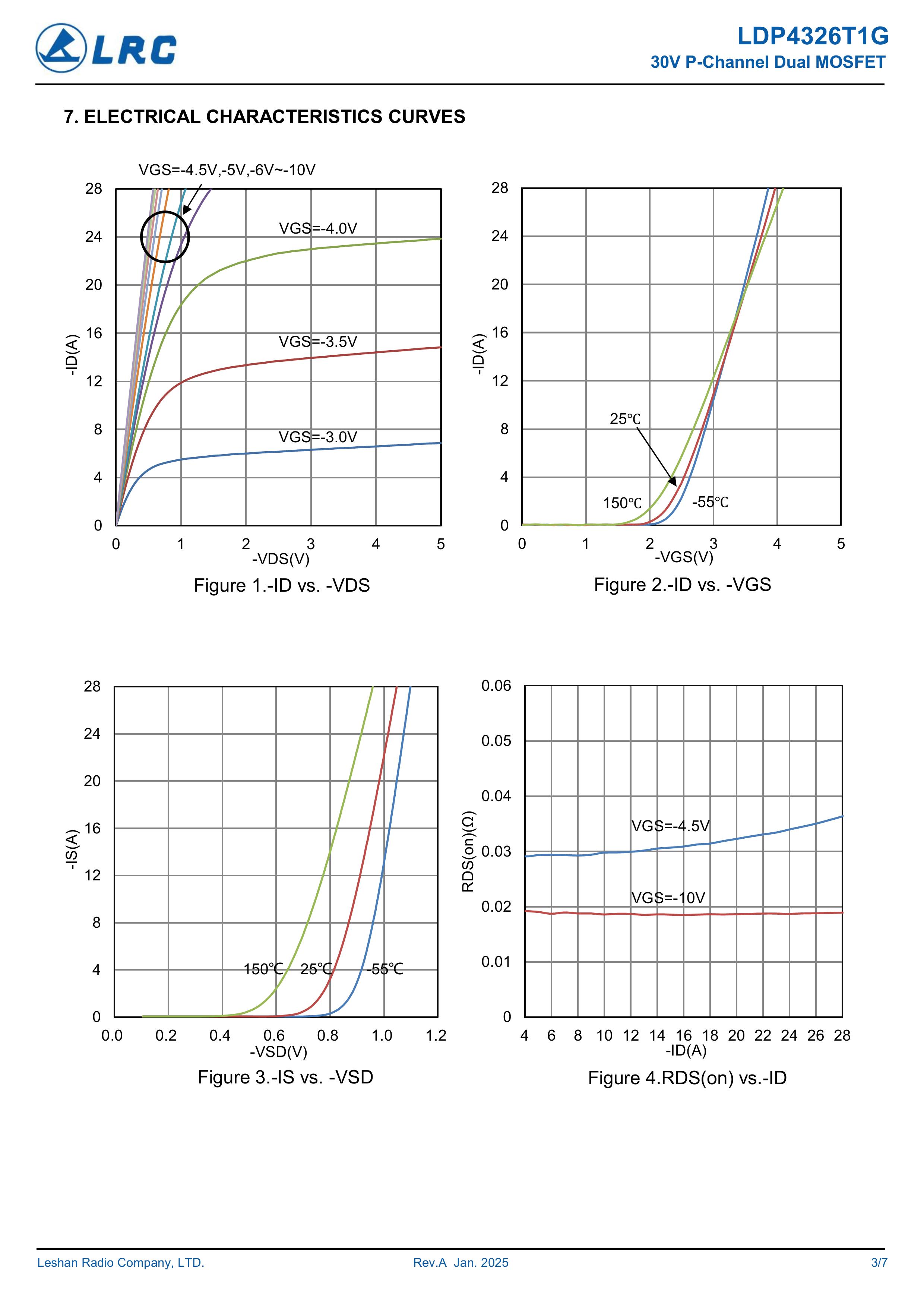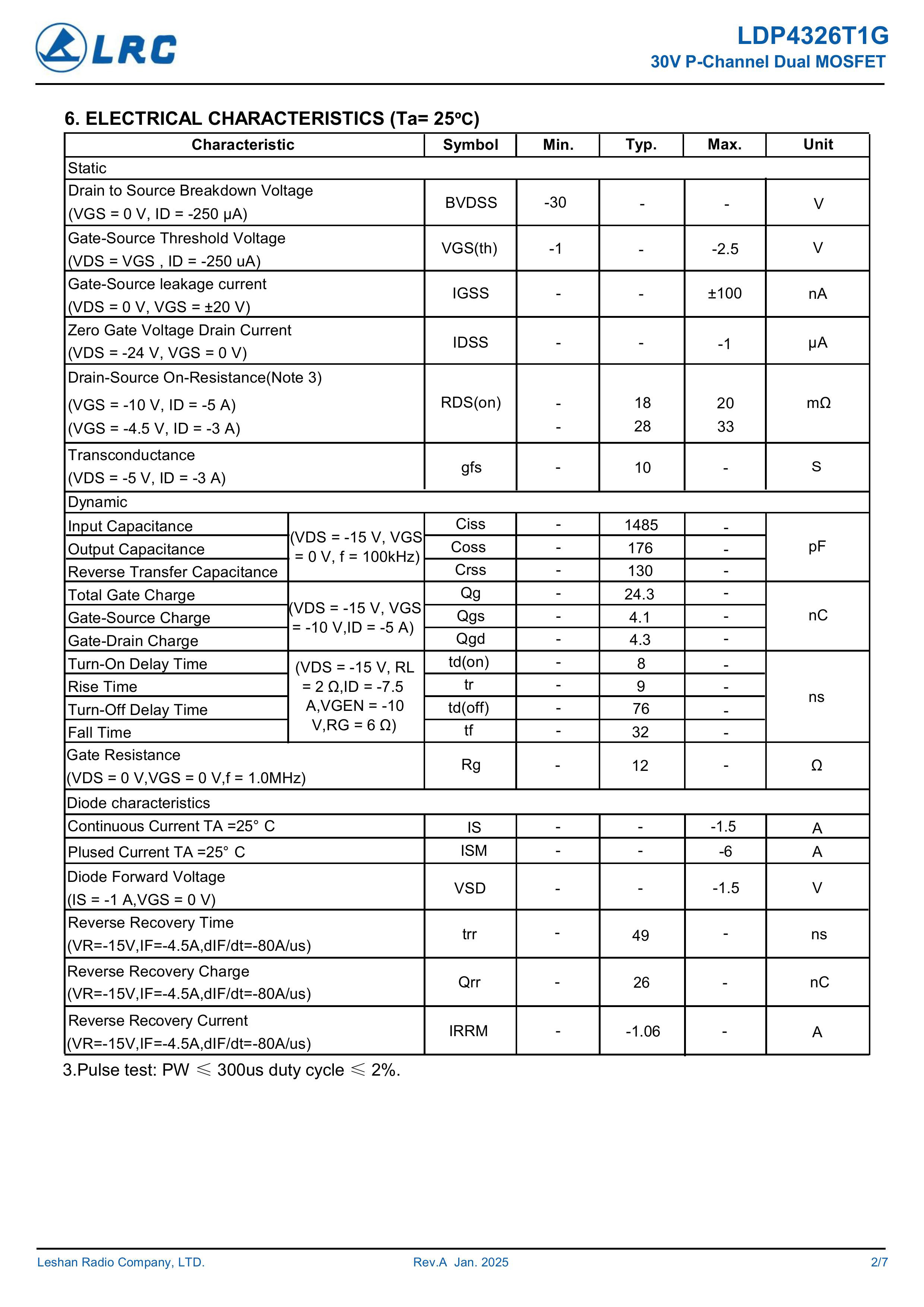 LRC/乐山无线电 LDP4326T1G/4098 全新原厂原装中低压高频分立功率器件电子开关场效应管,P型沟道双管场效应管负电压-30V、-7A、20mΩ、P-Channel、贴片式中低压MOSFET: LDP4326T1G/4098。Vds电压:-30V;Id电流:-7A;Rds(on)内阻:20mΩ;封装方式:SOP-8;最小包装数量:4000pcs/盘-编带。