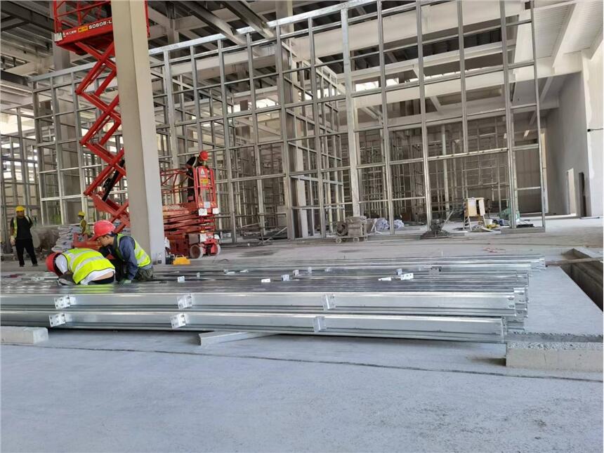 成品防爆墙:一般用两层特制防爆板,主龙骨为间距不大于1.2m槽钢,次龙骨为不大于1.2m角钢,抗爆板用自攻螺丝固定在龙骨上,两层抗爆板间填岩棉防火。成品抗爆墙可根据工程具体特点进行设计生产定做,以满足对抗冲击波压力和时限的要求。