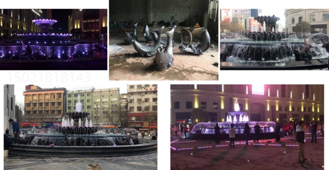 这款喷泉雕塑位于南宁北广场,双层主体都是由黄铜打造,上下盘边为波浪形,喷泉流水是非常好看,盘壁和盘底镌刻古代云纹、将复古于潮流相结合,四周还有一条条活灵活现的鲤鱼作为装饰,整体效果很是好看。适合公园、广场、小区、别墅摆放。