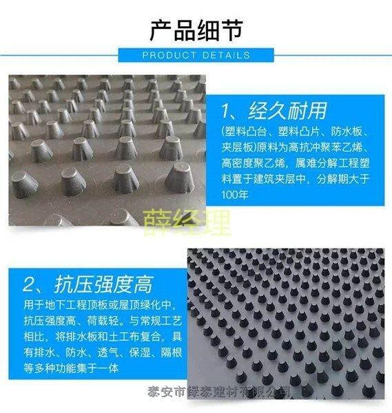 泰安市绿泰排水板厂家常年生产:20排水板卷材,30厚车库排水板,35蓄排水板,屋顶美化用排水板,20高镂空蓄排水板,30高园林绿化用蓄排水板,40不镂空块状排水板。东营16高全新料复合排水板当天发货