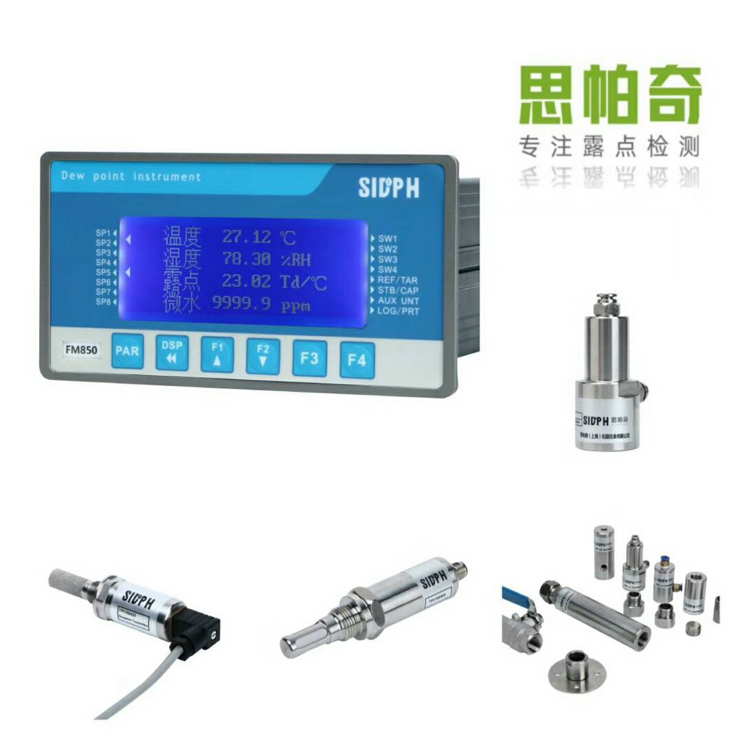 在线式露点仪FM850露点测量的典型应用思帕奇露点仪表被应用在常规气体湿度极低的工业露点测量领域。露点通常是关键性参数,控制不到位会引发生产停机、损坏工艺设备,导致产品质量下降。在各种干燥和热处理工艺中均需测量露点数据。在压缩空气中也要控制露点参数,湿度过大将会导致终端产品质量低劣、结冰和设备腐蚀问题。其他常见应用还包括医用气体、锂电池生产的干燥环境以及电力行业使用的高电压气体绝缘设备。校准周期我们推荐每一年校准一次,如果需要进行校准调试,可送至思帕奇上海 维修中心。思帕奇上海具备露点仪校准标定企业。在线式露点仪FM850创新设计FM850在线温湿度露点仪的结构设计非常精巧,采用标准的面板式安装(168 x 96mm)尺寸,可以方便地安装在任何控制面板上.报警器设定按钮位于前面板, FM850的功能模块可以单独选配,它们分别是模拟量输出模块,通讯模块,继电器控制模块.FM850提供的模拟输出是两路三线制共地4…20mA电流信号或0…10V电压信号。用户可以通过跳线实现4…20mA或0…10V 转换,模拟输出信号用于远程传输,记录,控制或数据处理。每路模拟输出均可以设定为温度、湿度、露点中任意之一。 FM850 标配四路继电器触点信号输出,可分别针对温度、湿度、露点的上下限进行触发,由常开状态切换为常闭状态。在线式露点仪FM850探头技术指标测量参数露点温度测量范围(典型值)精度(详见图表)输出数字接口