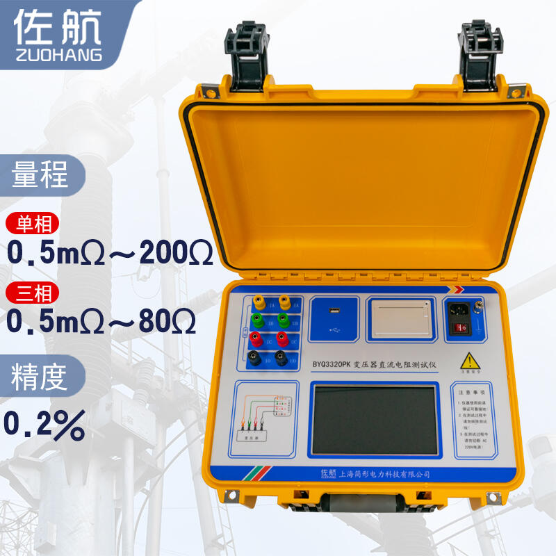 佐航BYQ3320PK变压器直流电阻测试仪是集三相测试( Yn ,Y 、△)和消磁功能于一体的新一代快速测试仪,是测量大型电力变压器直流电阻的理想设备。屏幕采用真彩色高分辨率工业显示屏,全触控操作,具有中文菜单提示功能,操作简便直观,测试速度快,准确度高,量程宽。