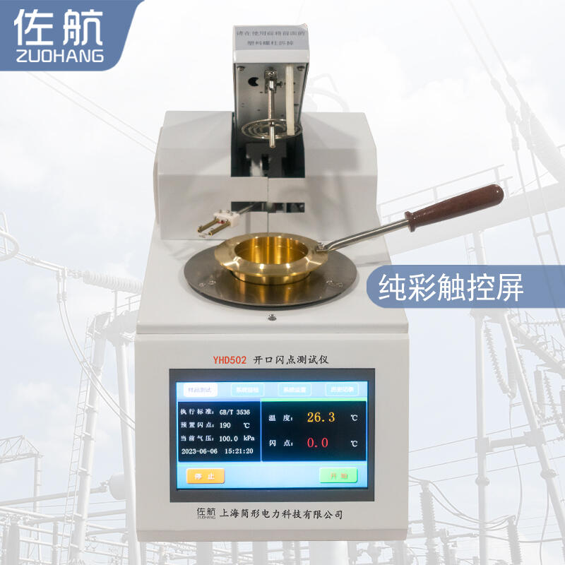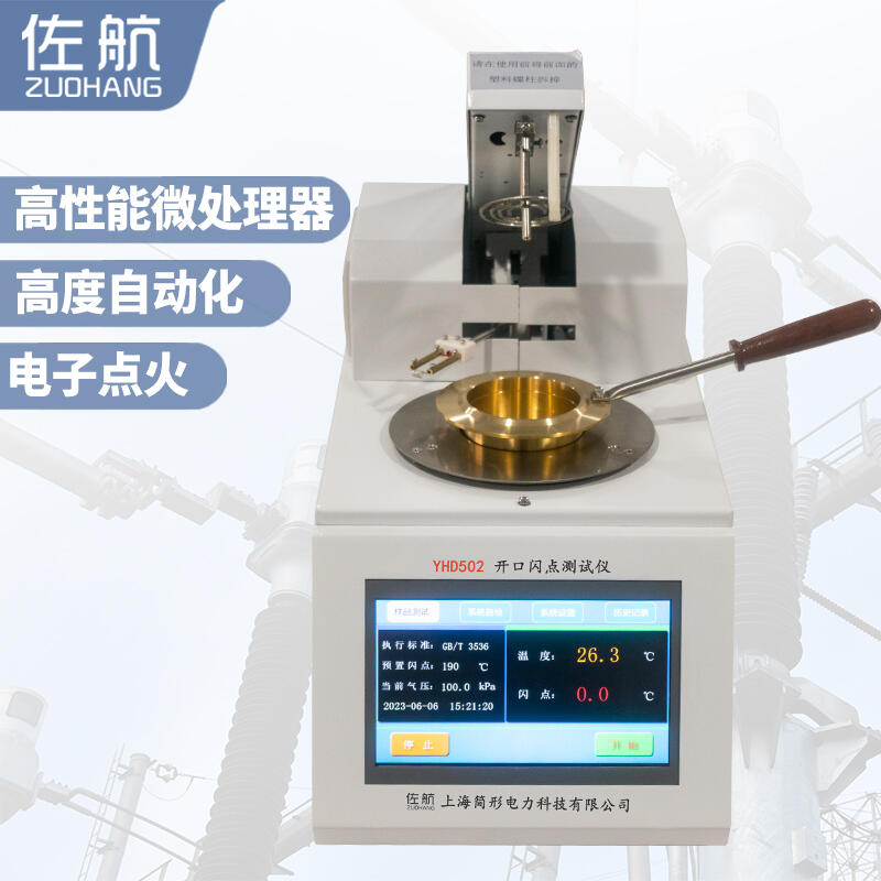 佐航YHD502全自动开口闪点测定仪,用来测定石油产品的开口闪点值。仪器采用电点火方式,无需任何可燃性气体,符合GB3536-2008、GB267-88的方法要求。采用ARM系列高性能微处理器,电擦除存储器(可存储上千条数据记录),7寸彩色液晶显示器及触摸屏,PID自整定等多项技术。