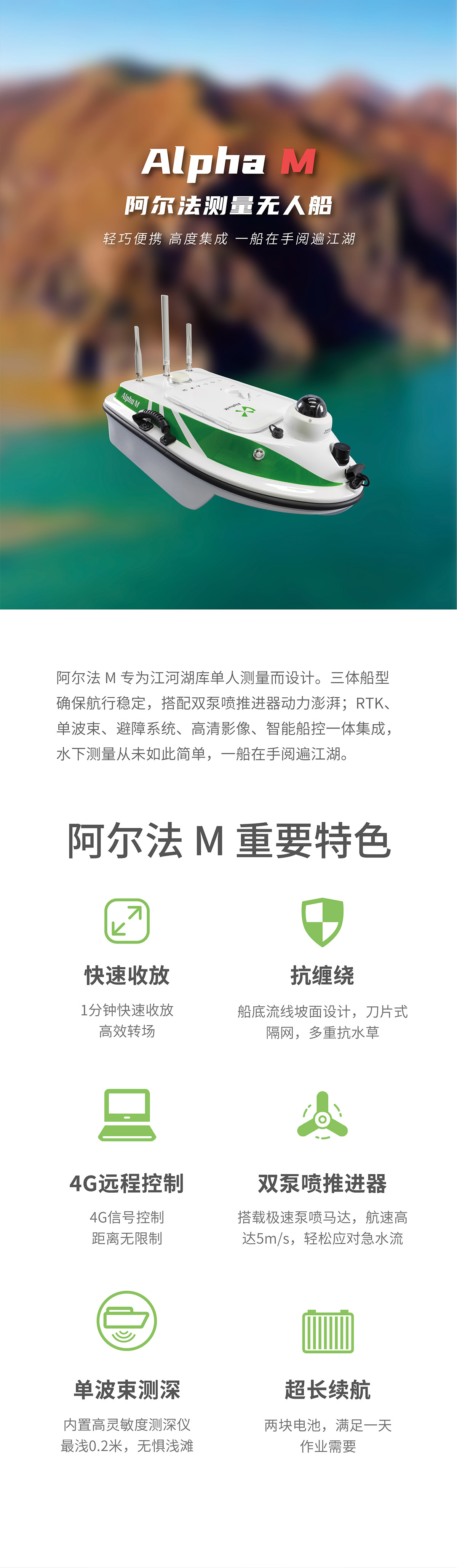 阿尔法M测量无人船 标配RTK、单波束、高清影像避障