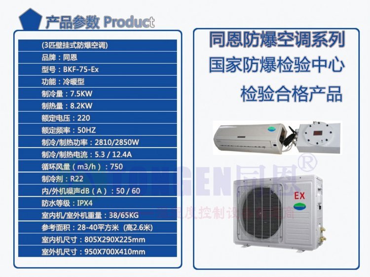 北京防爆空调BKG-120-Ex, 变电站防爆空调价格,同恩防爆空调厂家--防爆空调,适用于II类A B 或C ,温度组别为T1~T6,防爆空调含有性气体环境危险场所的0区、1区、2区;以及含有性粉尘与空气混合物的20区、21区或22区所有危险区场所使用(订货须注明)。防爆空调主要用于石油、化工 油库、化学品仓库、海洋石油平台等易燃、易爆环境的制冷和制热,防爆空调的外观和用法与普通空调 样。防爆空调按工作环境分为高温、低温、特高温、特低温之分。
