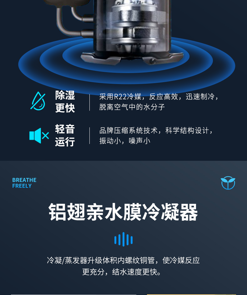 本产品属冷冻式除湿机,整机有压缩机、热交换器、风扇、机壳及控制器组成,其工作原理是:由风扇将潮湿空气抽入机内,经过制冷系统(压缩机,蒸发器,冷凝器)相互作用下凝结成霜,系统自动升温化霜成水流入盛水箱,产生出干燥空气排出,如此循环使室内湿度降低,潮湿空间逐步达到干爽的效果。