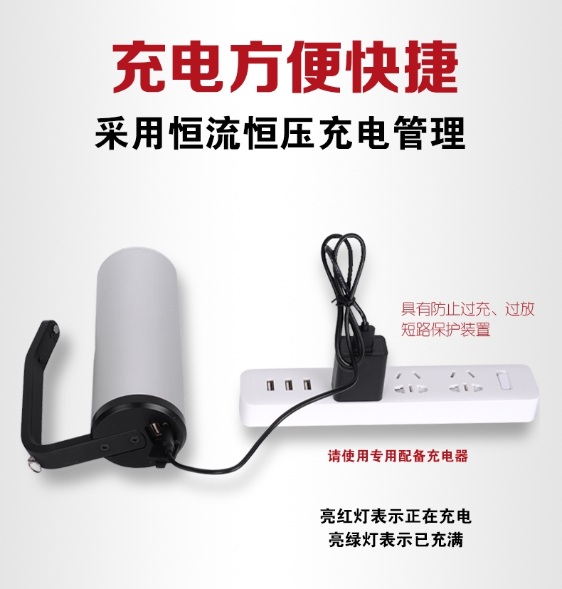 智能控制:采用轻触式调光开关,强光和工作光可随意转换;智能型充电方式适用于5V2A以上充电器,灯具内部设有过充保护及充电显示装置,并设有输出功能,任意模式下长按3秒切换输出功能可对数码产品进行充电,再次按下切换照明模式,并切断充电输出功能;