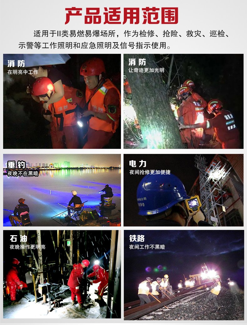 适用于II类易燃易爆场所,作为检修、抢险、救灾、巡检、示警等工作照明和应急照明及信号指示使用。(1区、2区)。