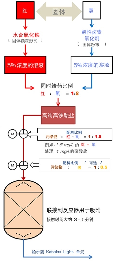 由于REDx现在能将OXYx组成中硫酸盐,催化产生具有2.5-3.1伏的氧化还原电位的硫酸根(SR)自由基。由异相生成的硫酸根自由基,现在能将溶解于水中的REDx离子改变成絮凝物。金属氢氧化物即为(FeOOH) 絮凝物,像吸附剂KATALOX LIGHT可以藉由方便地过滤去除。