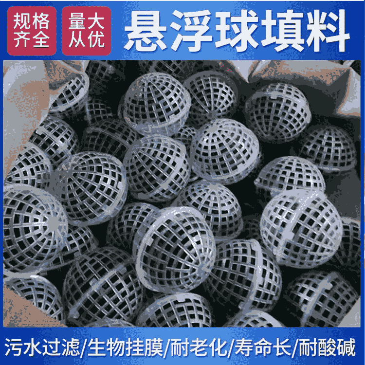 悬浮球填料,又称多孔旋转球形悬浮填料,是对国内处理污水,生物膜法处理技术采用的多种填料中开发的最新系列产品。在污水的生化处理中具有全立体结构,比表面积大,易挂膜,不堵塞,微生物易生成,易更换,耐酸碱,抗老化,不受水流影响,使用寿命长,剩余污泥少,直接投放,无须固定,安装方便。