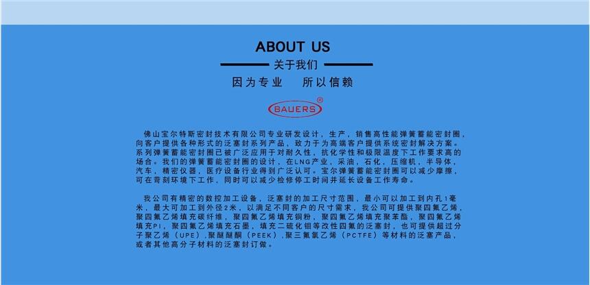 佛山宝尔特斯密封技术有限公司 我公司有精密的数控加工设备,泛塞封的加工尺寸范围,内孔1毫米到外径2米。以满足不同客户的尺寸需求,我公司可提供聚四氟乙烯,聚四氟乙烯填充碳纤维,聚四氟乙烯填充铜粉,聚四氟乙烯填充聚苯酯,聚四氟乙烯填充PI,聚四氟乙烯填充石墨,填充二硫化钼等改性四氟的泛塞封,也可提供超过分子聚乙烯(UPE),聚醚醚酮(PEEK),聚三氟氯乙烯(PCTFE)等材料的泛塞产品,或者其他高分子材料的泛塞封订做。