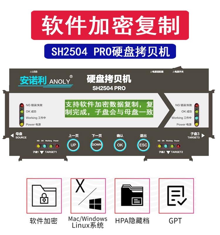 SH2504PRO 高速随身型,配备 SATA接口,SSD硬盘对拷测试传输速度,实测值达每秒 250 MB ( 每分钟18GB ) ,并可加购 IDE、mSATA、M.2 NGFF(SATA) 等接口的拷贝功能。透过各种转接装置更具接口弹性,除了支持各种品牌、容量 的 标准 2.5", 3.5" SATA、SATA2、SATA3 或 IDE 接口 的 HDD硬盘 (支持 12TB 以上)、 SSD硬盘 外,也同步支持固态的 mSATA SSD (mini SATA SSD)、M.2 NGFF(SATA) 等新的硬盘拷贝。提供各种拷贝需求的用户一个合适的选择,且易于使用,无需复杂的操作学习。