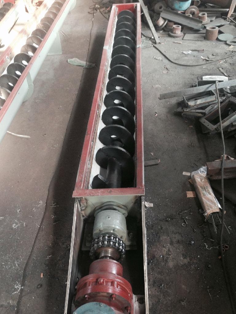 GX型螺旋输送机是利用旋转的螺旋将被输送的物料沿固定的机壳内推移而进行输送工作,头部及尾部轴承移至壳体外,吊轴承采用滑动轴承设有防尘密封装置,轴瓦一般采用粉末冶金,输送水泥采用毛毡轴瓦,吊轴和螺旋轴采用滑块连接。