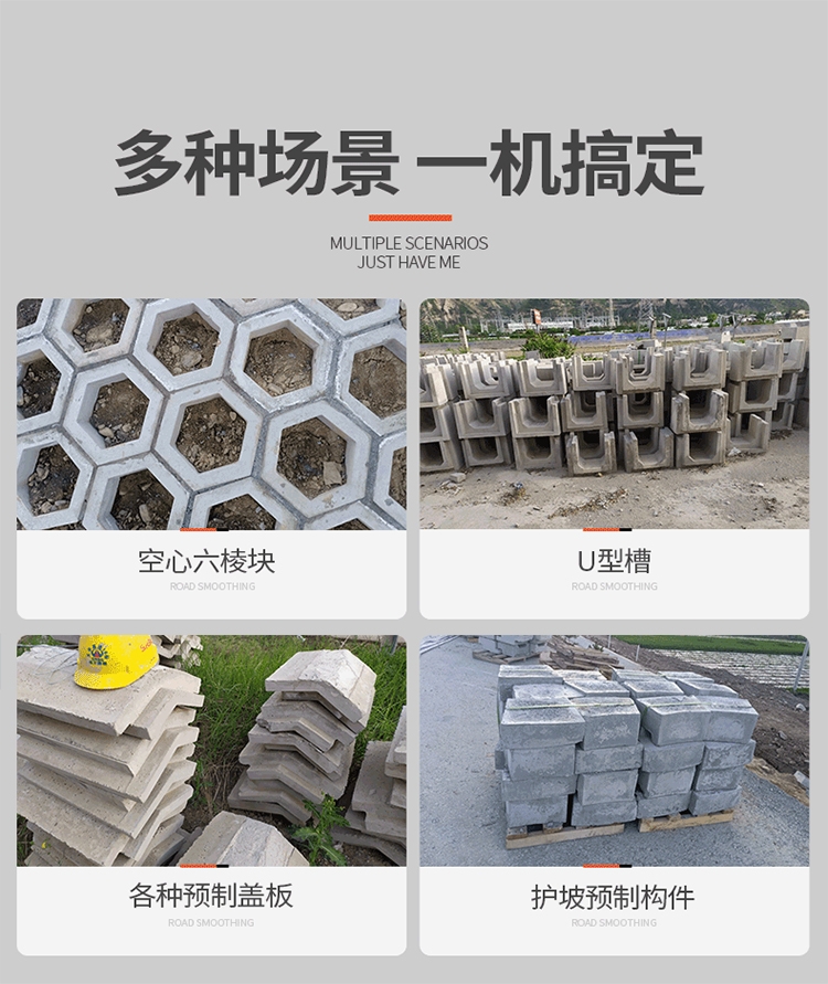 我厂主营:,,。用途广泛,生产的小型预制构件种类多,范围广,边沟盖板、六棱块、路沿石、护坡砖、拱形骨架都可以生产,一机多用,整机仅需3人即可操作。