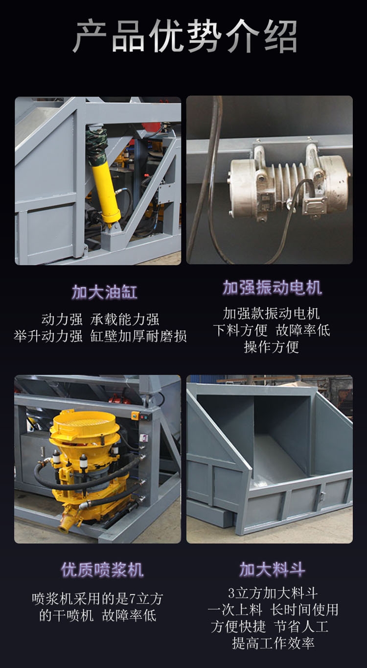 产品优势 采用先进的液压,起降料斗迅速,设计合理,操作简便,变频调节,控制添加剂用量,载重农用车动力,马力强劲,控制液压支腿升降操作简单快捷,采用先进的液压,起降料斗迅速吊装式喷浆车 喷浆用的喷浆车 豫龙牌喷浆机组 喷浆车。