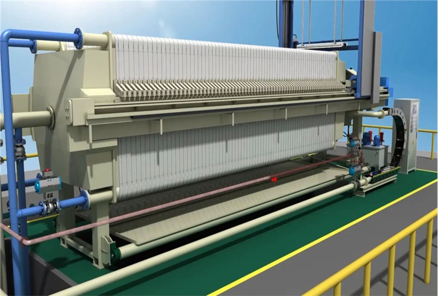 隔膜压滤机是滤板与滤布之间加装了一层弹性膜的压滤机。使用中,当入料结束,可将高压流体或气体介质注入隔膜板中,这时整张隔膜会鼓起滤饼,进而实现滤饼的进一步脱水,是通常讲的压榨过滤。