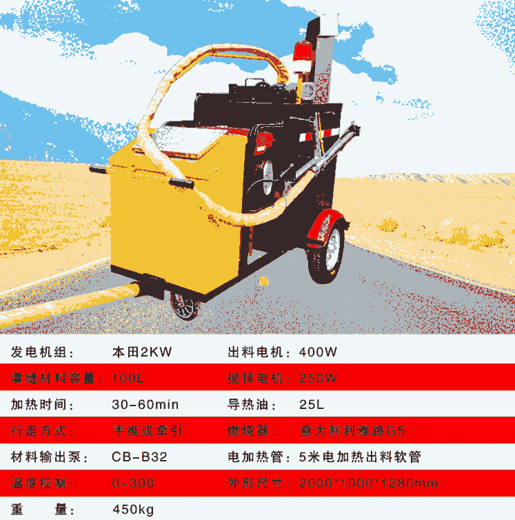 主要用于沥青路面或水泥路面裂缝沥青灌缝。适用于普通沥青和灌缝胶材料;灌缝料通过沥青泵输出,流量速度可调节。灌缝机属于路面机械,主要用于对路面问题的预防性养护,一般与开槽机、灌缝机、吹风机(或热喷枪)配套使用