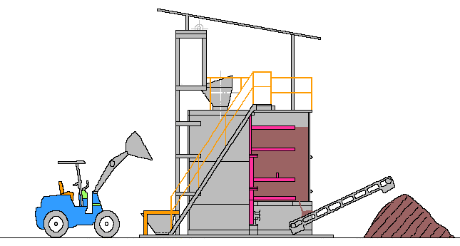 经混合好的物料由装载机输送至设备配套提升料斗内,由自动上料装置、投料口配合将料斗提升、投入至发酵仓中,完成自动上料过程。