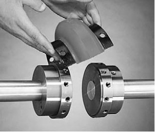 将半个莱克斯诺弹性体联轴器Omega?安装在轴套上并拧紧自锁螺栓。通过Omega?弹性体确定另外个轴套的间距,再固定那个轴套。