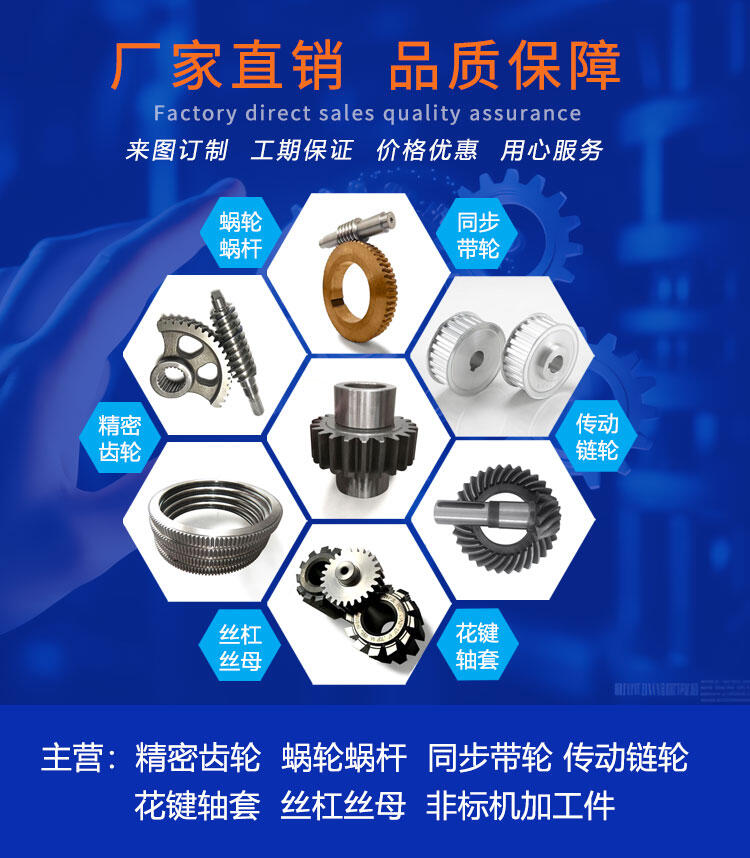 公司经营的产品有:齿轮、齿条、链轮、链条、蜗轮、蜗杆、伞齿轮、螺旋伞齿轮、同步带轮、联轴器、皮带轮、多楔带轮、花键轴、花键套、万向节、锥套、涨紧套等传动件,同时,本公司可以根据客户要求来设计加工非标规格的产品,公司产品广泛应用于印刷机械,旋转压片机,码垛机,焊接设备,食品机械,包装机械,灌装机械,输送机械,数控机床,航空航天,机器人等自动化生产线。
