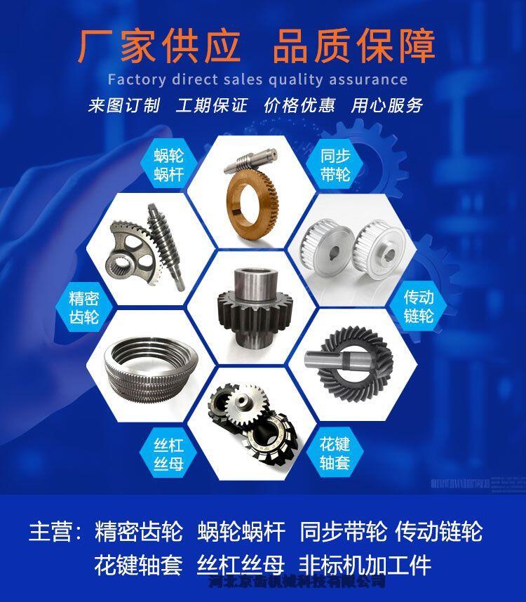 公司经营的产品有:齿轮、齿条、链轮、链条、蜗轮、蜗杆、伞齿轮、螺旋伞齿轮、同步带轮、联轴器、皮带轮、多楔带轮、花键轴、花键套、万向节、锥套、涨紧套等传动件,同时,本公司可以根据客户要求来设计加工非标规格的产品,公司产品广泛应用于印刷机械,旋转压片机,码垛机,焊接设备,食品机械,包装机械,灌装机械,输送机械,数控机床,航空航天,机器人等自动化生产线。