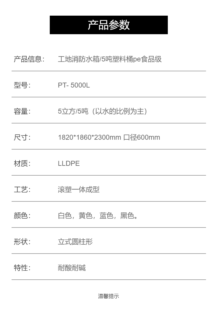 5吨工地临时消防水箱5立方塑料桶五吨水罐尺寸PE食品级材质