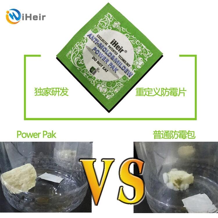 iHeir高效环保的 Power Pak强效防霉片是艾浩尔开发的高科技产品。已经在国内外申请多个项目的发明专利,Power Pak从山葵和芥末中提取的成分芥末精油做成的抗菌因子能够抑制霉菌和细菌的成长而且可以防止霉的繁殖,而且对小苍蝇等害虫有忌避效果。其防霉机理是常温升华将芥末油精做成的抗菌因子带到产品包装环境中,利用气体的流动平均分布于全部空间,从而杀死青霉、曲霉、球毛霉等霉菌,制造不利于霉菌生长的环境。在保护期内防霉效果非常明显。