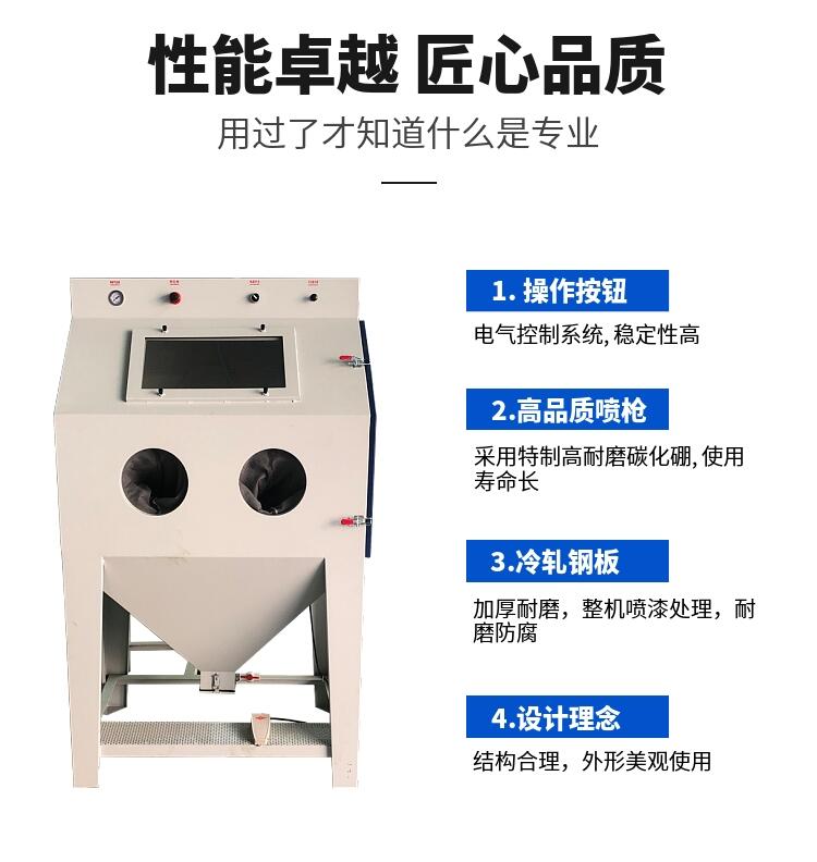2.要看产品的形状,选择喷砂机的规格,一般一米以下的都有固定的规格,特别大的要订做或选择开放式的。